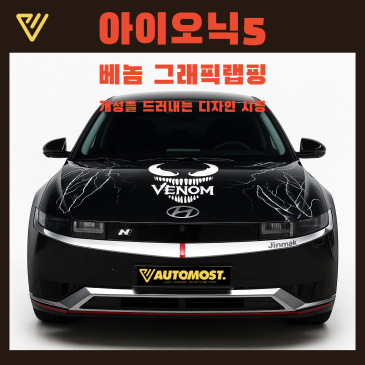 아이오닉5, 블랙 컬러 위에 더해진 강렬한 그래픽 아이오닉5는 미래지향적인 전기차 디자인으로 많은 사랑을 받고 있지만, 블랙 컬러 차량은 종종 밋밋하게 느껴질 수 있습니다. 이번 고객님은 단순한 색상 변화를 넘어, 본넷 한정으로 캐릭터성을 극대화하는 베놈 그래픽 랩핑을 원하셨습니다. 함께 시공기 보시죠~ 안녕하세요. 오토모스트입니다. 차량은 단순히 이동수단이 아닌 나만의 개성을 표현하는 작품으로 만들어가는 곳, 바로 저희 오토모스트입니다. 오늘은 아이오닉5 블랙 차량에 진행된 베놈그래픽 본넷 랩핑 시공 현장을 소개해드립니다. 3M 180MC 실사 출력 필름사용 이번 시공에는 3M 180MC 필름을 사용했습니다. 이필름은 고해…….